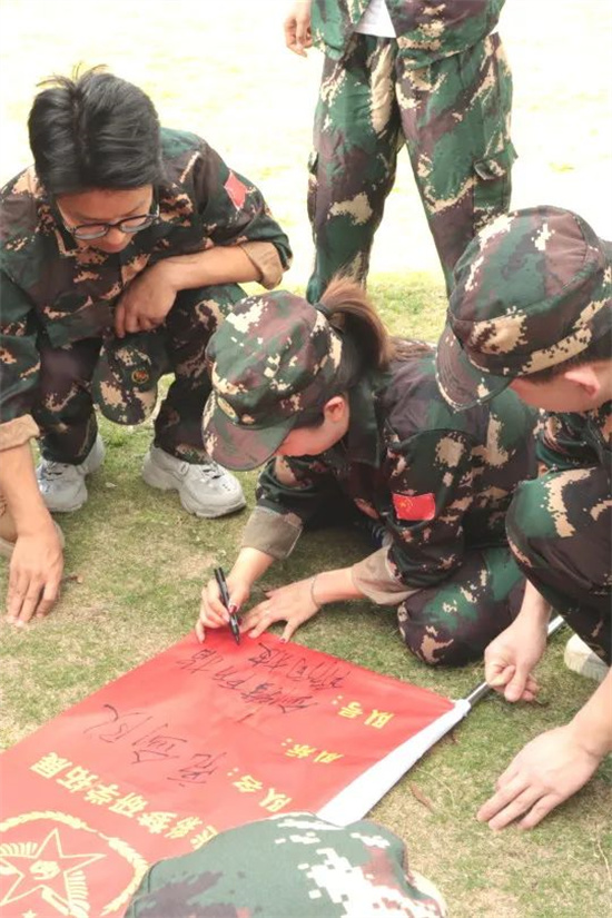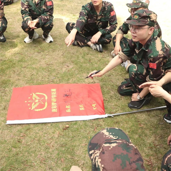 士兵突擊、火速變裝完,軍訓(xùn)的感覺一下就上來了。經(jīng)過簡單的桃花朵朵開環(huán)節(jié)、集合分組、起隊名、喊口號一系列操作直接讓我們從開始的拘謹(jǐn)變得士氣滿滿,各團隊就此組建完成。